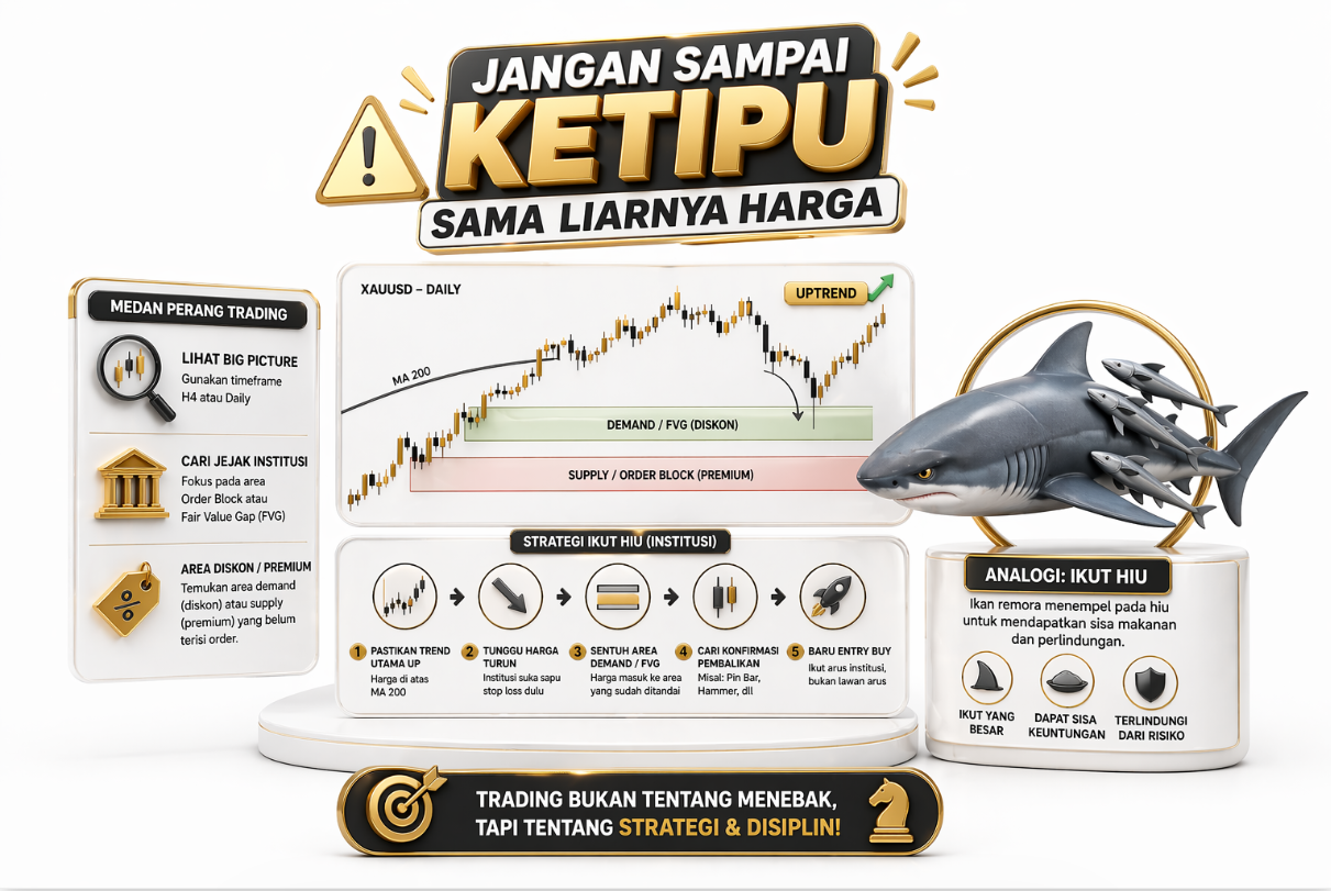 Nah, di artikel ini kita gak akan bahas teori-teori berat yang bikin pusing. Tapi lebih ke gimana cara “bertahan hidup” di tengah kegilaan emas kayak gini. Caranya simpel, intinya cuma gimana traders bisa ngendaliin diri sendiri dan paham kapan harus ikut arus smart money. Jadi daripada terus-terusan setor duit buat bayar biaya false breakout, mending simak dulu artikel ini sampe akhir ya.