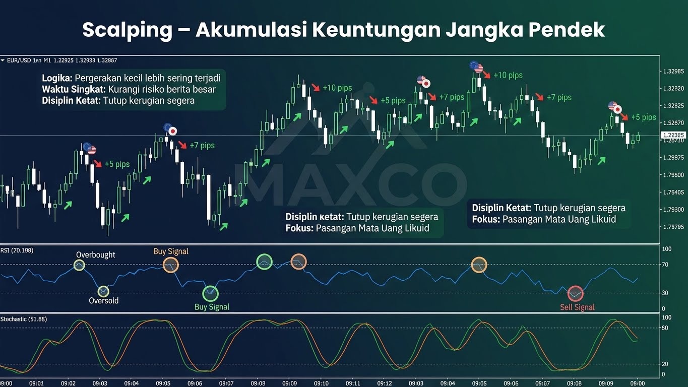 Berbeda dengan dua strategi sebelumnya yang mungkin menahan posisi selama berjam-jam atau berhari-hari, Scalping adalah strategi frekuensi tinggi. Trader Maxco yang menerapkan ini bertujuan mengambil keuntungan kecil (5-10 pip) namun dilakukan berulang kali sepanjang hari.