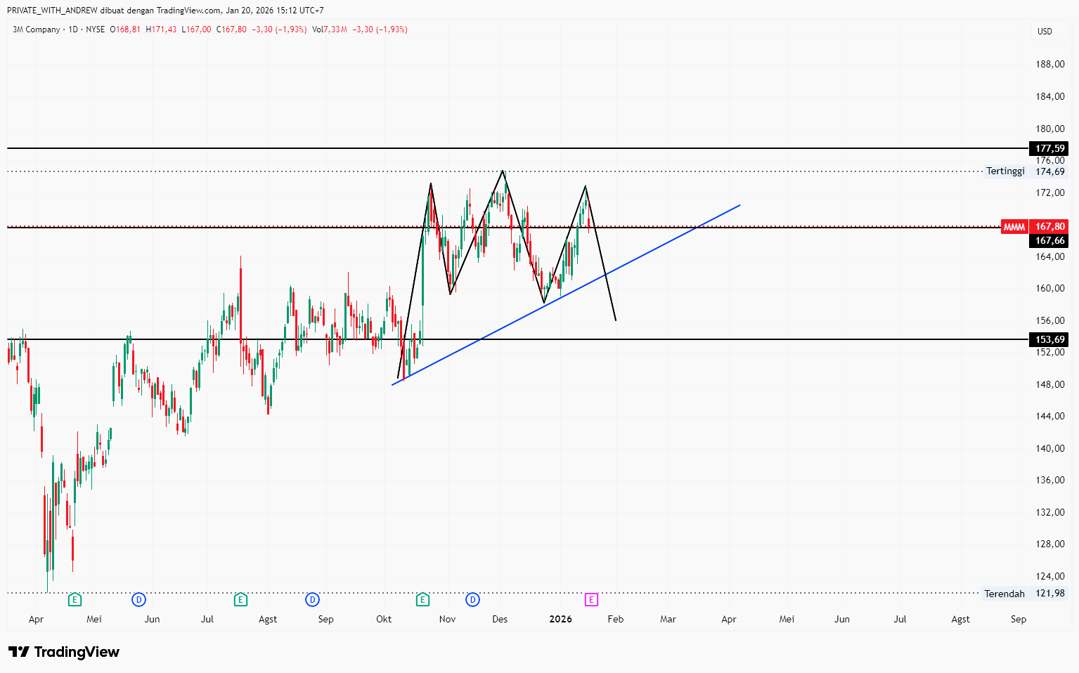 Dalam jangka pendek, reaksi pasar terhadap laporan Q4 diperkirakan akan cukup volatil. Hasil kinerja yang sejalan dengan ekspektasi, namun disertai guidance 2026 yang lebih optimistis, berpotensi menjadi katalis positif bagi saham 3M. Sebaliknya, panduan yang terlalu konservatif dapat memperkuat pandangan bahwa pemulihan masih membutuhkan waktu lebih panjang.