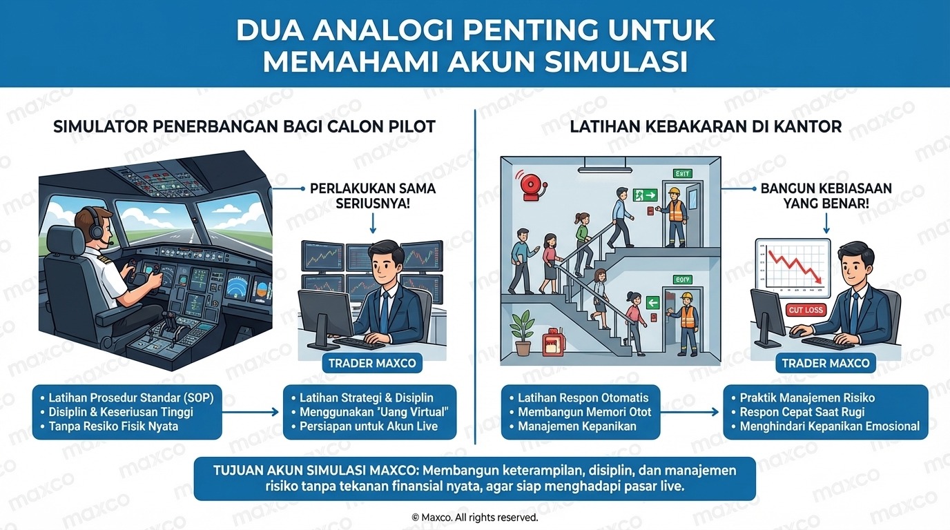 - Simulator Penerbangan untuk Calon Pilot: Sebelum seorang pilot diizinkan menerbangkan pesawat komersial yang membawa ratusan penumpang, mereka wajib menghabiskan ratusan jam di dalam mesin simulator. Mesin ini tidak terbang sungguhan, dan jika pesawat di layar simulator jatuh, pilot tersebut tidak akan terluka. Namun, setiap calon pilot memperlakukan simulator itu dengan sangat serius. Mereka menekan setiap tombol sesuai prosedur operasi standar. Jika Trader Maxco ingin menjadi trader profesional, akun simulasi harus diperlakukan persis seperti simulator penerbangan. Prosedur dan kedisiplinan harus ditegakkan sejak awal, meskipun “uang” yang digunakan tidak nyata.
