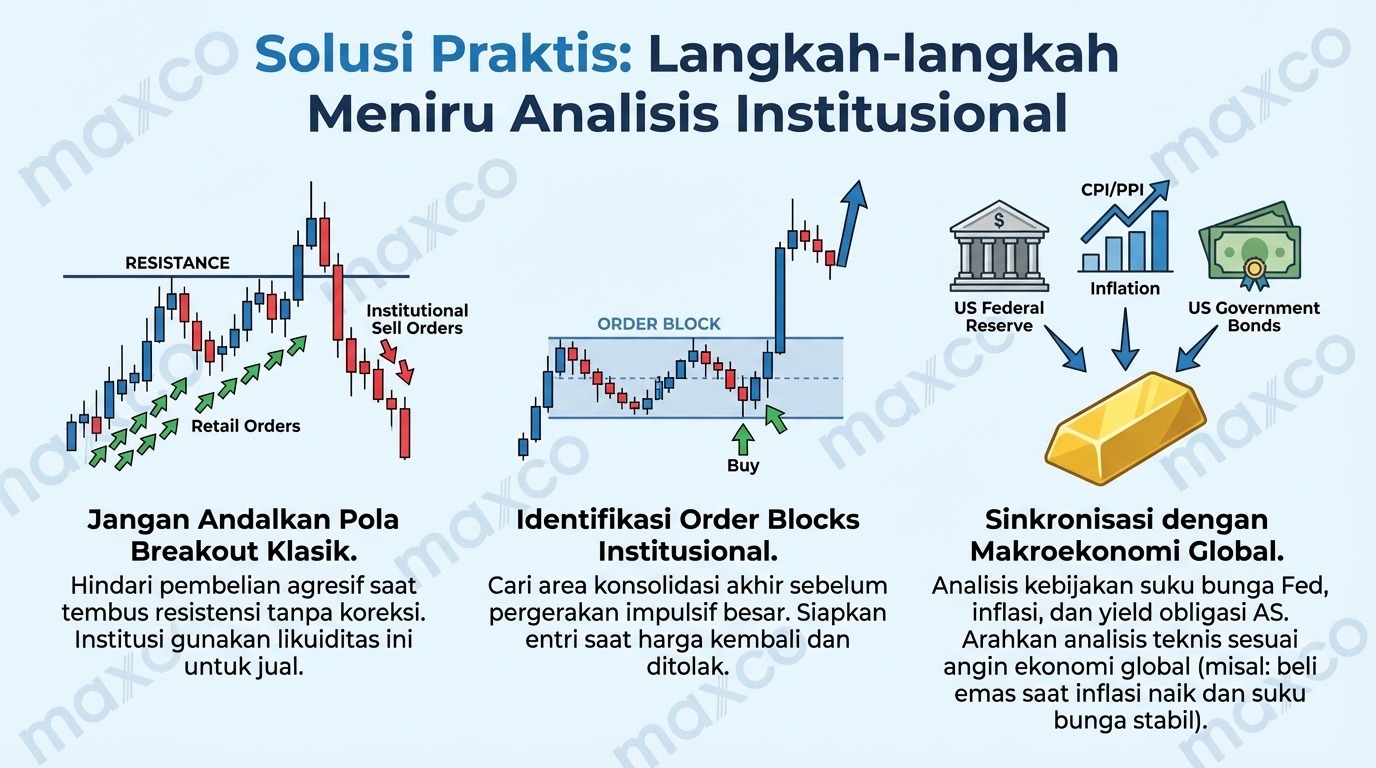 - Sinkronisasi dengan Makroekonomi Global Institusi tidak menggerakkan miliaran dolar hanya berdasarkan pola grafik segitiga (triangle pattern). Mereka menghitung kebijakan suku bunga bank sentral Amerika Serikat (The Fed), data inflasi (CPI/PPI), dan imbal hasil obligasi pemerintah AS. Jika inflasi naik namun suku bunga ditahan, nilai tukar mata uang akan melemah. Dalam kondisi rasional seperti ini, Big Money akan mengamankan kekayaan mereka ke dalam aset emas. Analisa teknikal yang Trader Maxco lakukan harus selalu disinkronkan dengan arah angin ekonomi global ini.