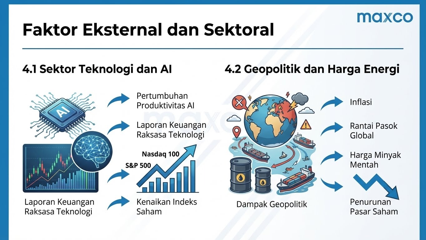 Trader Maxco perlu memperhatikan laporan keuangan (Earnings Report) dari perusahaan raksasa teknologi. Jika perusahaan-perusahaan ini melaporkan keuntungan di atas ekspektasi karena adopsi AI, indeks saham cenderung akan naik meskipun kondisi ekonomi makro sedang melambat.