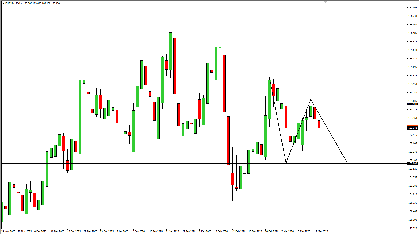 Kombinasi antara faktor teknikal berupa struktur lower high dan sentimen fundamental dari potensi penguatan yen dapat meningkatkan tekanan turun pada pasangan EUR/JPY. Kondisi ini membuka peluang koreksi harga menuju area support sebagaimana tercermin pada struktur teknikal saat ini.