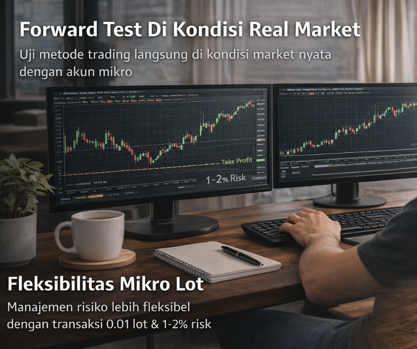 Sebelum mulai menggunakan suatu metode trading, alangkah lebih baiknya jika kita tes terlebih dahulu kelayakannya. Apakah strateginya works atau tidak di berbagai kondisi market. Ada istilah “backtest” yaitu latihan metode trading tersebut menggunakan history chart yang sudah terjadi, tapi kebanyakan backtest ini ya sama seperti menggunakan akun demo, tidak ada vibes real marketnya. Maka yang lebih baik jika kita tes di kondisi real market dengan melakukan forward test. Artinya kita menggunakan akun real dan langsung diaplikasikan metode tersebut. Vibes-nya dapet, dari sisi uji kesabaran, dari sisi mental saat menghadapi floating minus, dari sisi euforia saat take profit, dll. Tentu akun mikro sangat pas digunakan, dengan modal minim dan risiko yang minim ini bisa dimanfaatkan untuk menguji suatu metode di kondisi market yang real.