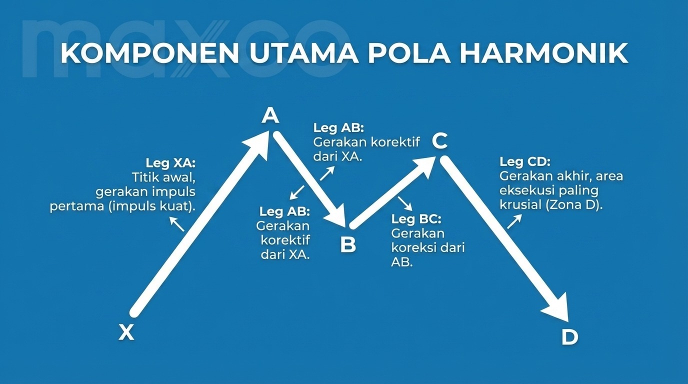 Sebelum membedah jenis-jenis polanya, Trader Maxco perlu memahami anatomi dasar yang membangun setiap struktur harmonik. Pola ini tidak berdiri secara independen, melainkan dirangkai dari titik-titik ayunan ekstrem harga (swing high dan swing low). Berikut adalah elemen dasarnya: