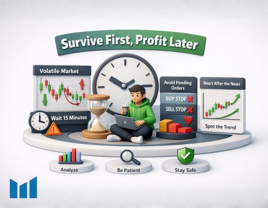 Setelah memahami risiko, sekarang kita masuk ke bagian yang lebih penting: strategi. Trader berpengalaman jarang mencoba menebak arah market tepat saat berita keluar. Mereka justru fokus pada satu hal sederhana: bertahan hidup lebih dulu.