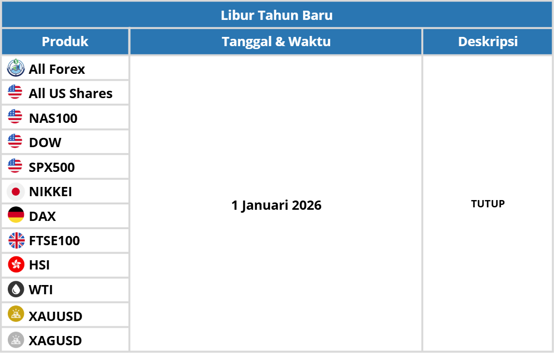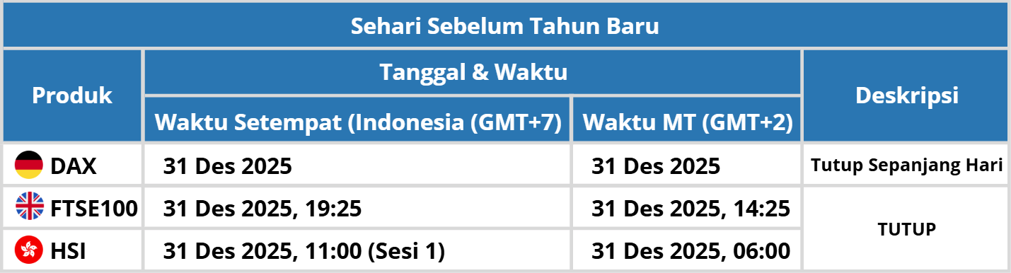 Mohon perhatikan berita penting di atas dan sesuaikan dengan kegiatan trading Anda. Selain instrumen yang disebutkan di atas, tidak ada perubahan pada instrumen dan market lain sehingga akan tersedia pada waktu perdagangan normal.