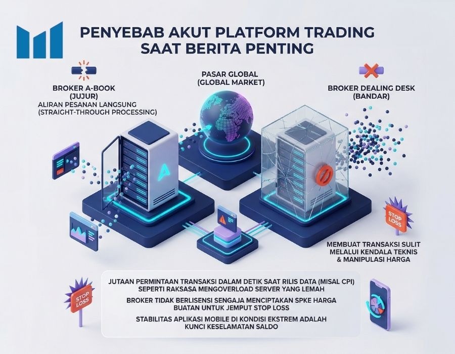 Mungkin kamu sering heran, kenapa aplikasi trading milikmu lancar-lancar saja saat market sepi, tapi mendadak sulit diakses atau sering disconnect saat rilis berita penting? Jawabannya ada pada kapasitas server dan kejujuran manajemen sistem broker tersebut. Saat rilis data seperti CPI besok malam, ribuan atau bahkan jutaan permintaan transaksi masuk secara bersamaan dalam hitungan detik. Jika broker tidak berinvestasi besar pada teknologi, server mereka akan crash atau sengaja diperlambat untuk membatasi eksposur risiko mereka sendiri.