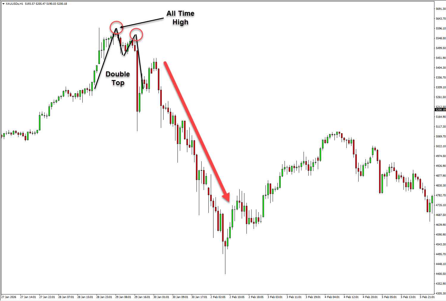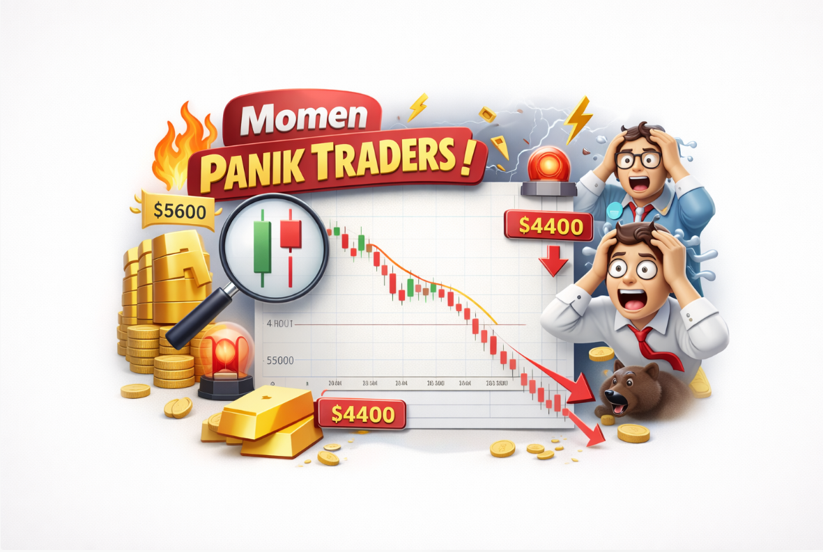 Tapi setelah mengetahui pola apa itu, ternyata yang dimaksud adalah double top, Hanya dalam waktu dua hari saja, pasar ambruk luar biasa dari harga tertingginya. Bayangkan harga tertinggi emas hampir $5600, terjun bebas anjlok hingga ke $4400-an.