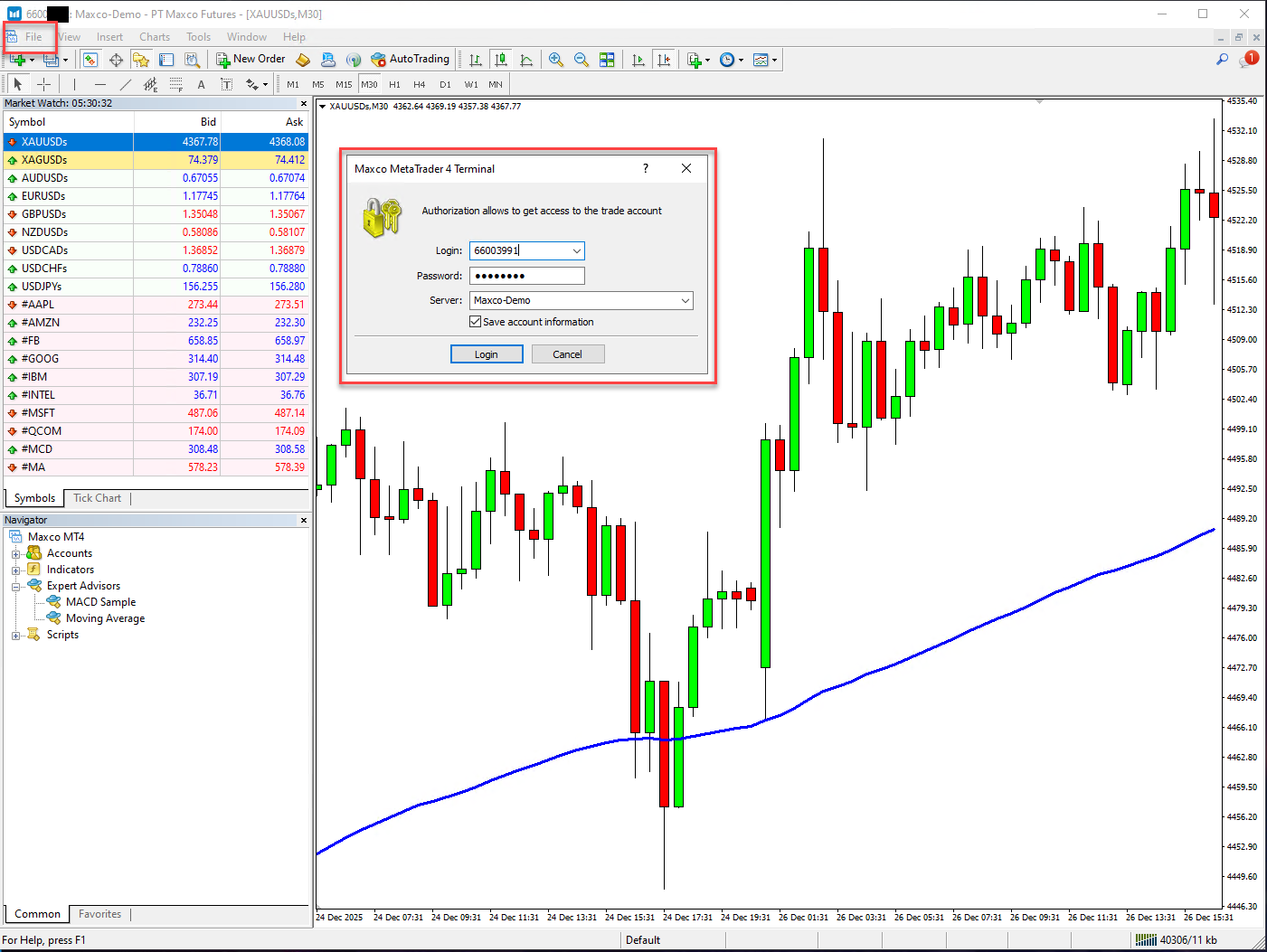 Singkat cerita setelah install aplikasi MT4 di desktop dan akun telah selesai diajukan, maka akan dikirimkan informasi loginnya melalui email, barulah kita loginkan di metatrader 4 dengan cara buka menu File – Login to Trade Account – Isi informasi akun yang terdiri dari ID, Password, dan Server Broker.