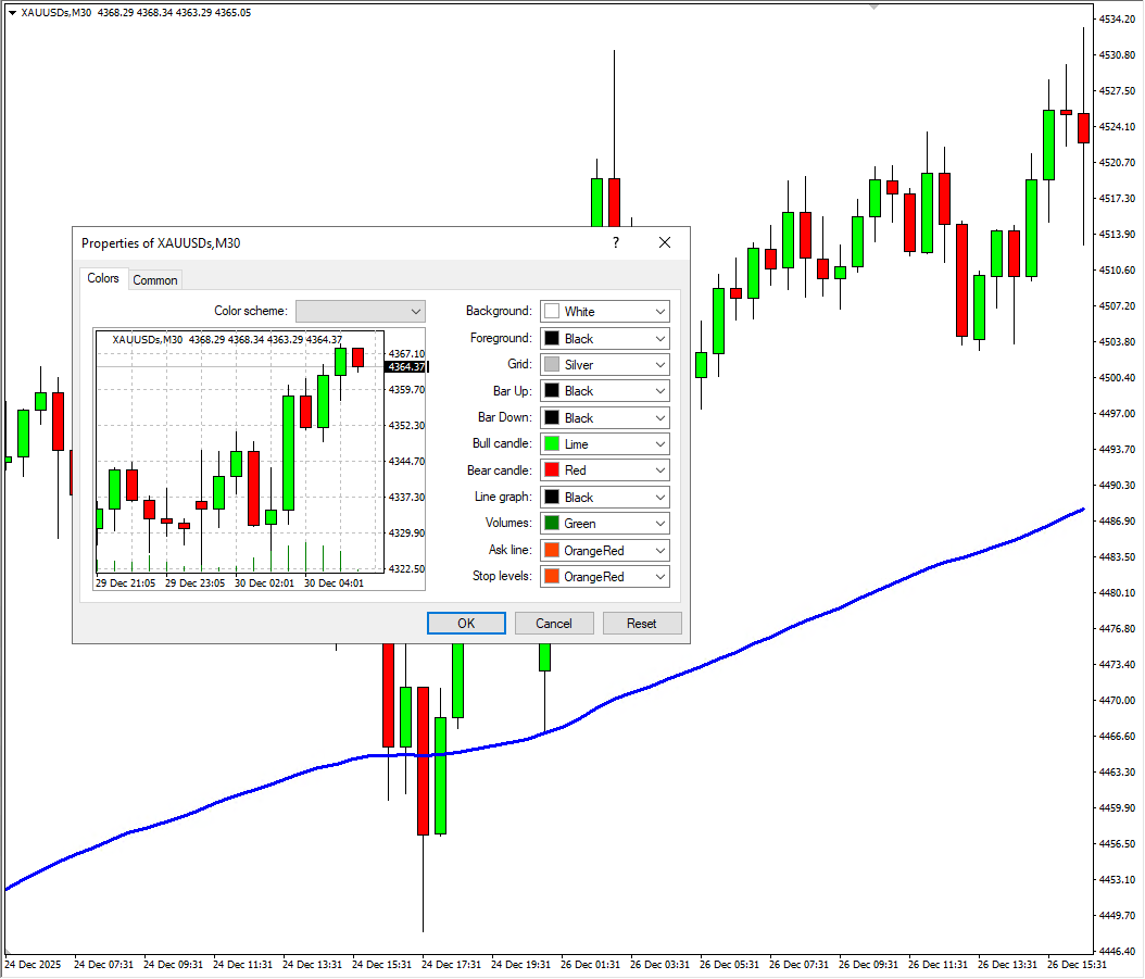 Setelah berhasil login, traders bisa lihat menu chart secara langsung, nah secara settingan standard itu chartnya kurang enak dilihat dengan tampilan gelap, kita perlu setting terlebih dahulu dengan cara klik kanan di chartnya, lalu pilih menu properties di paling bawah. Setelah itu ubah warna background, bull candle dan bear candle, atau sesuai preferensi masing-masing.