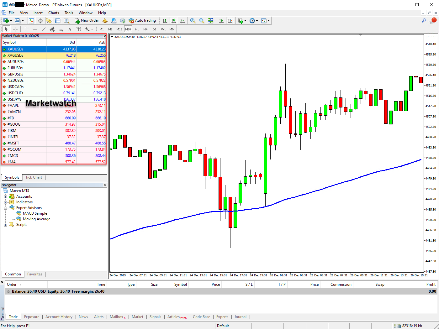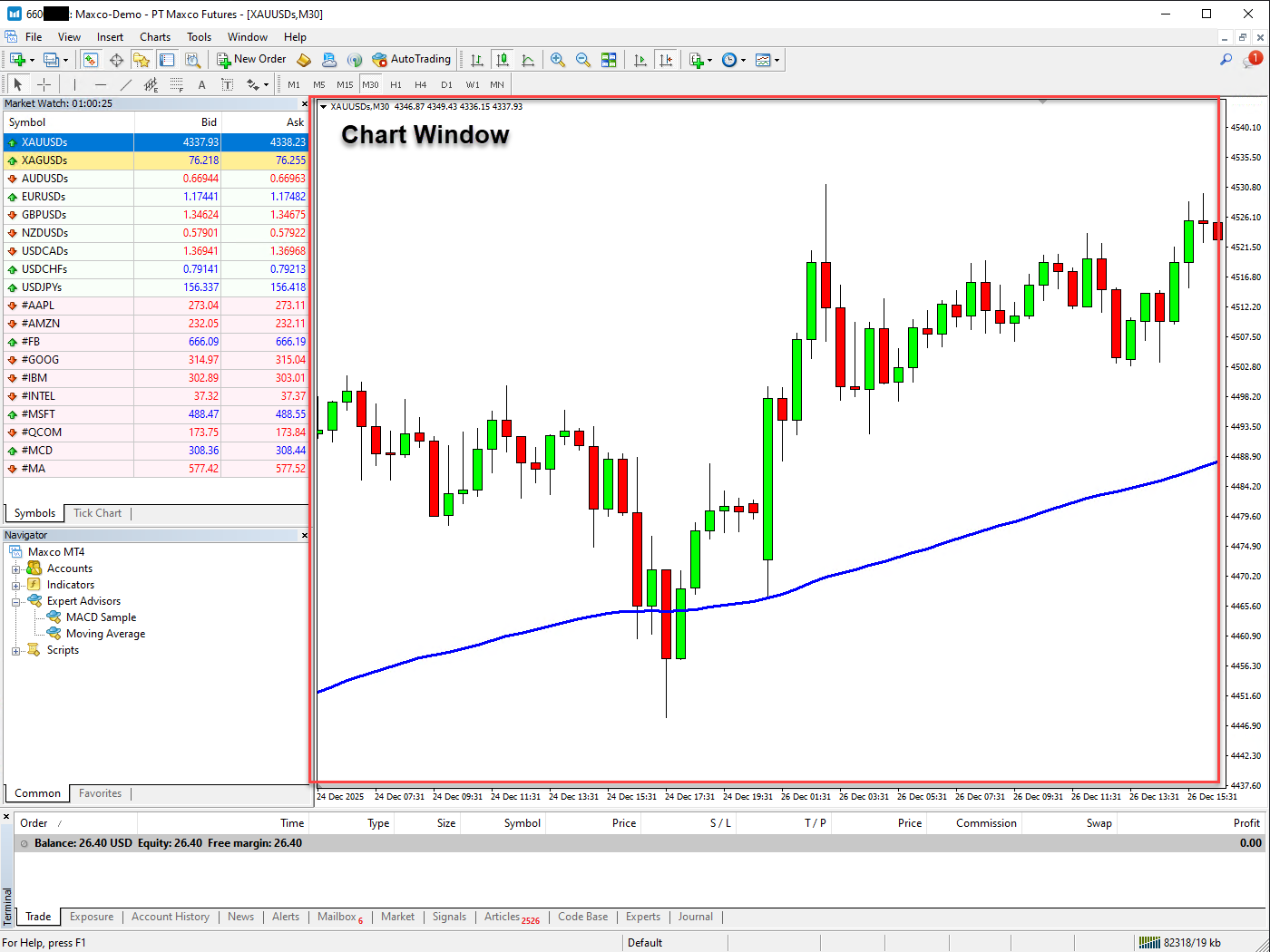 Saat pertama kali masuk ke metatrader, kita bisa melihat dashboard utamanya yang terdiri dari : marketwatch, navigator, chart dan terminal yang akan kita bahas secara detail di bawah ini.