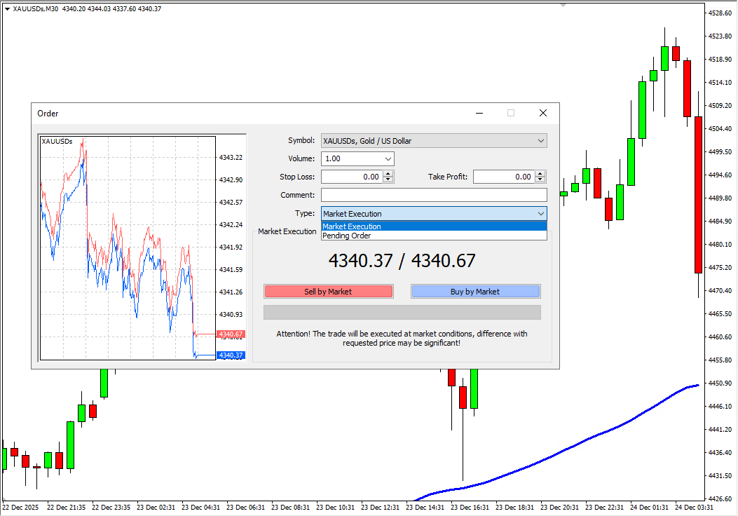 Market execution yaitu order transaksi (buy atau sell) dengan harga detik ini juga. Jangan lupa pastikan volume (lot) sesuai dengan modal yang traders punya. Jangan terlalu besar, bisa di test terlebih dahulu dengan lot terkecil untuk melihat kira-kira perubahan equity sudah sesuai atau belum di posisi yang sedang berjalan.