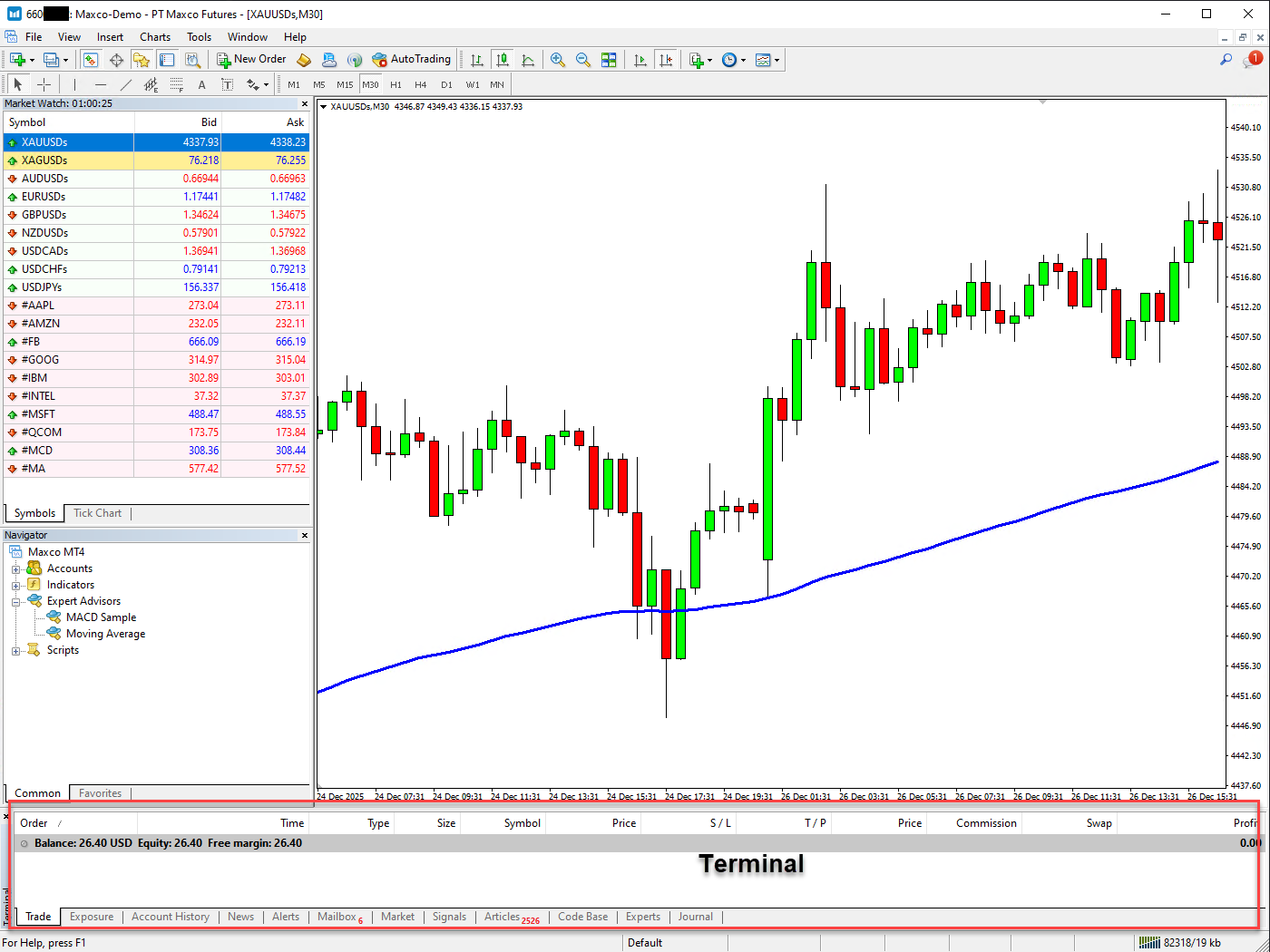 Di menu terminal ini menampilkan informasi balance, equity, dan free margin dari akun trading anda. Selain itu juga bisa melihat semua transaksi yang sudah terjadi atau yang sedang running.
