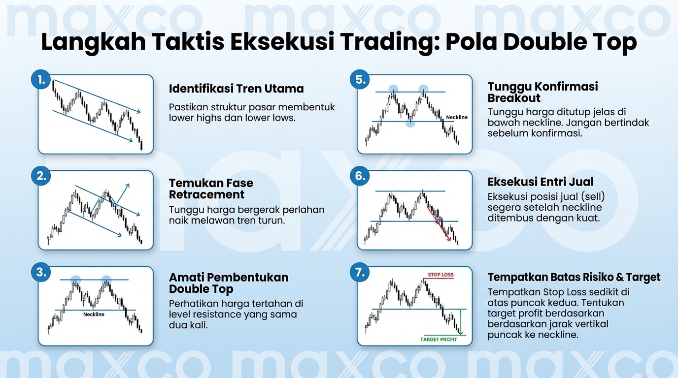 - Analisis Candlestick: Cari pola lilin penolakan (seperti Shooting Star atau Bearish Engulfing) tepat di area puncak kedua sebelum melakukan antisipasi ke bawah.