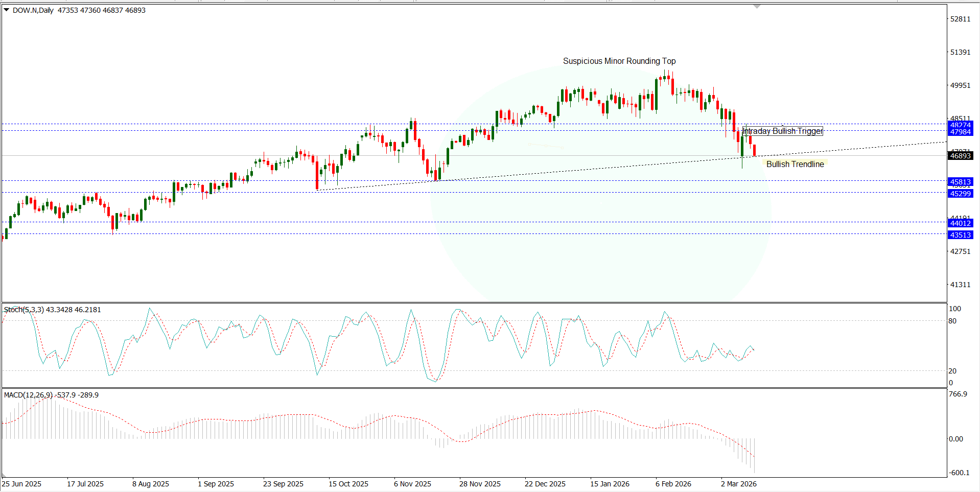 - Suspicious Rounding Top pattern pada pola harian yang memiliki potensi penuruan mendekati level 44000
