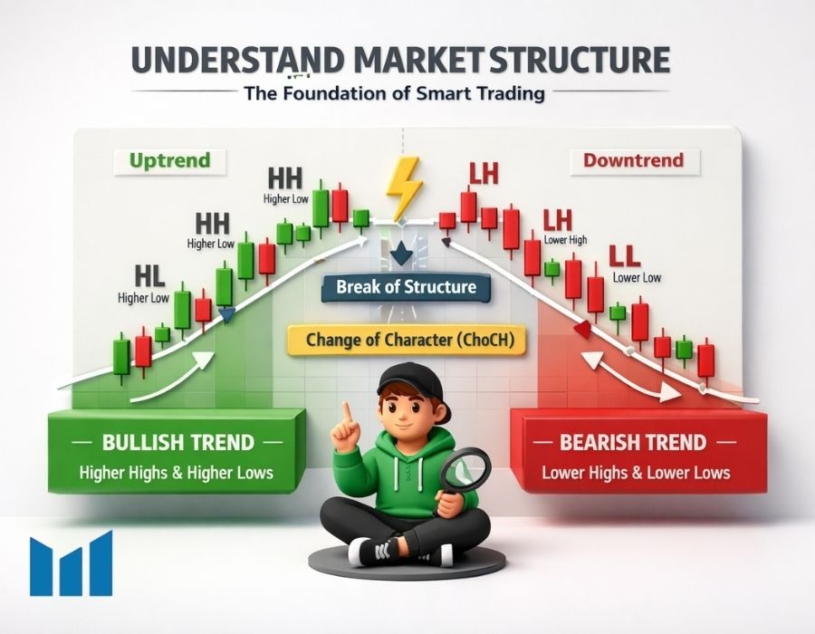 Market structure itu cara harga membentuk pola Higher High (HH) dan Higher Low (HL) dalam tren naik, atau Lower High (LH) dan Lower Low (LL) dalam tren turun. Dari sinilah kamu tahu arah dominan market.