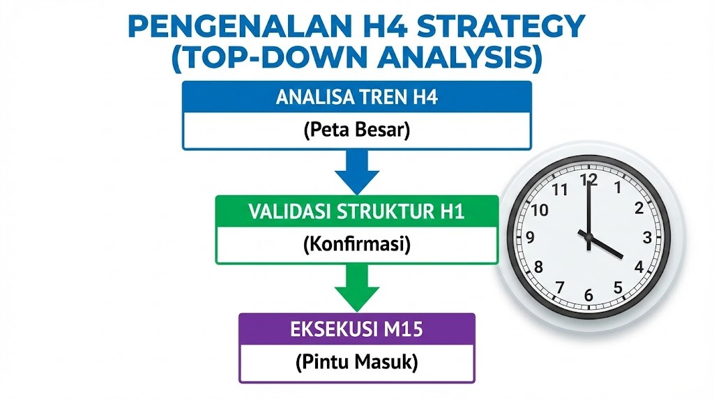 Cara Kerja Strategi H4 (Top-Down Analysis) Konsepnya sederhana: Lihat arah besaar, cari jalan masuk di peta kecil.