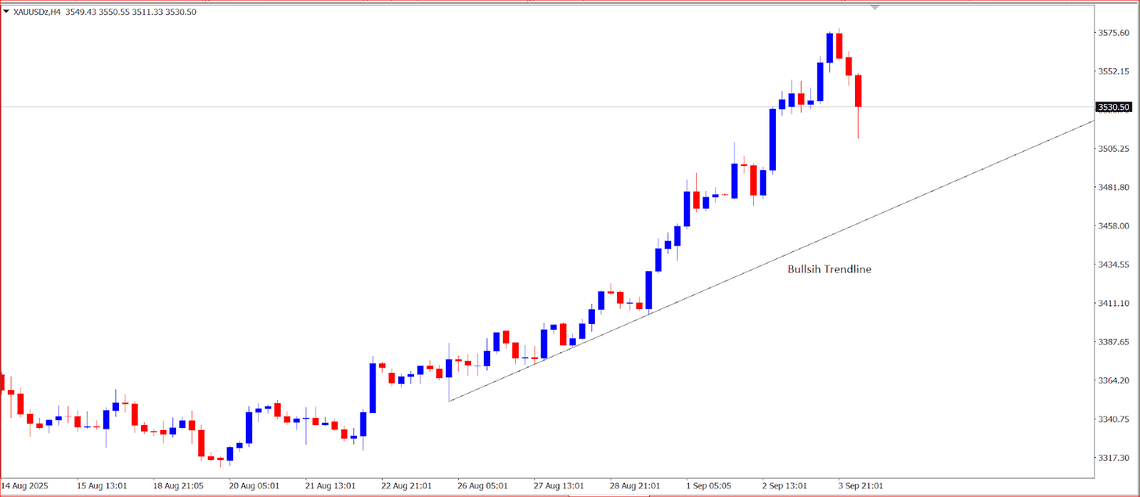 Harga emas dunia (XAU/USD) turun tipis pada perdagangan Kamis pagi (4/9/2025), setelah sebelumnya mencetak rekor tertinggi baru. Emas spot sempat menyentuh US$ 3.578,50 per ons troy, namun kemudian terkoreksi sekitar 1.3 % menjadi US$ 3512.