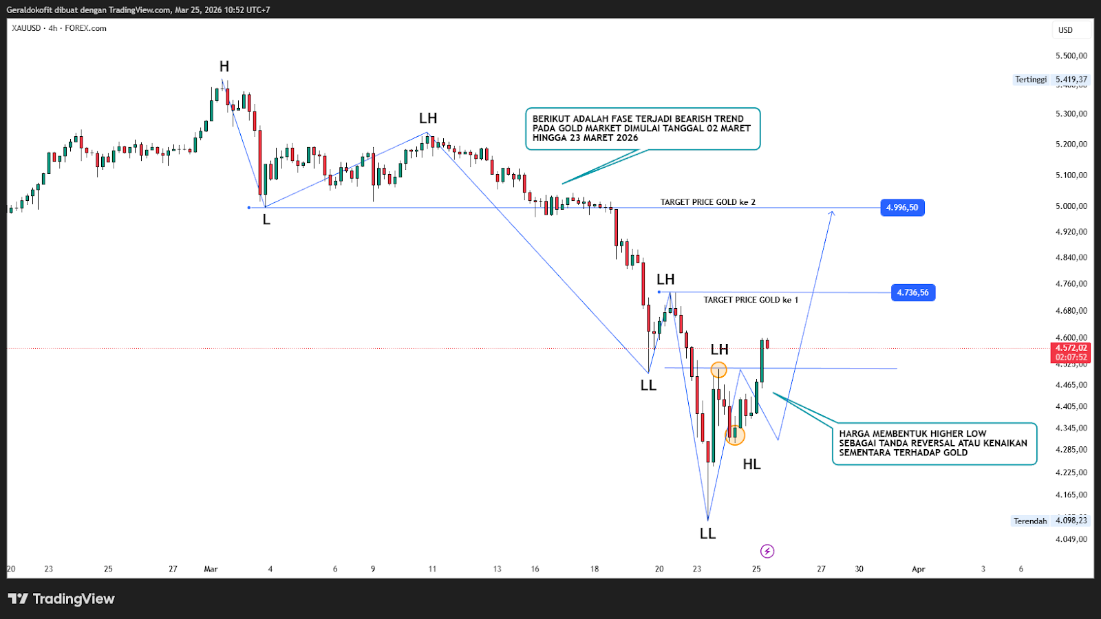 Caption: Pergerakan XAUUSD menunjukkan perubahan struktur dari bearish menuju potensi rebound, ditandai dengan terbentuknya higher low (HL) serta peluang kenaikan menuju area resistance 4730 – 4750.
