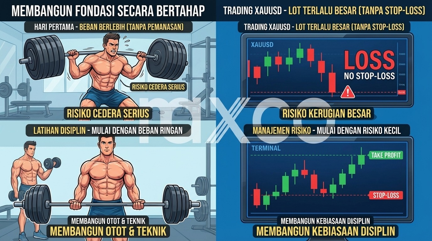 Di dalam Trading xauusd, mencoba mengangkat beban seratus kilogram pada hari pertama adalah ekuivalen dengan menggunakan ukuran lot yang terlalu besar tanpa menempatkan batasan kerugian (Stop Loss). Sedangkan postur dan teknik dasar yang benar adalah sistem manajemen risiko yang Trader Maxco terapkan pada setiap transaksi. Mulailah dengan risiko terkecil terlebih dahulu sampai metode eksekusi menjadi sebuah kebiasaan yang disiplin.