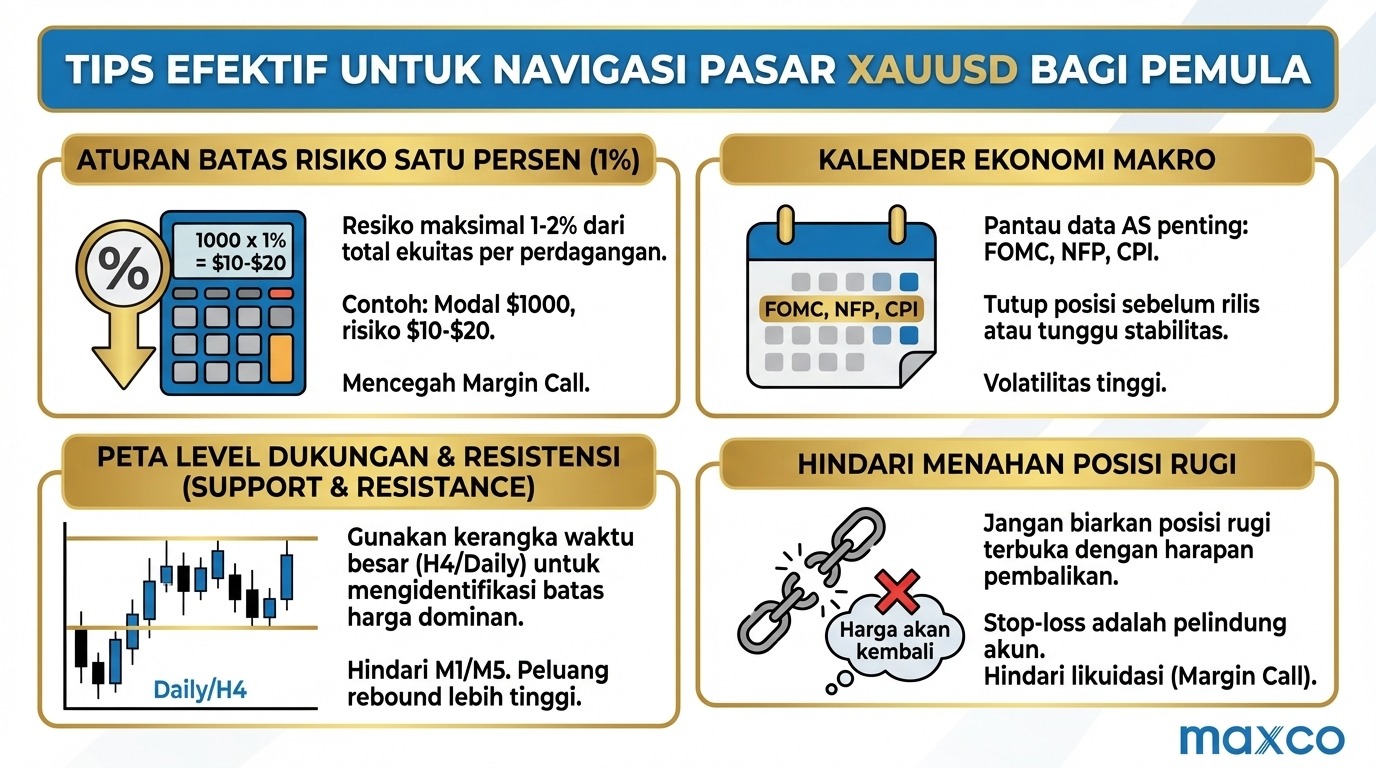 Artikel ini disusun untuk membedah akar permasalahan mengapa pergerakan emas kerap menguras saldo akun, sekaligus memberikan peta jalan yang rasional dan terstruktur. Trader Maxco akan mempelajari bagaimana memadukan pemahaman struktural pasar, manajemen modal yang presisi, dan pengendalian psikologi. Tujuannya bukan sekadar untuk menghindari kerugian total, melainkan untuk membangun sebuah sistem pertahanan yang kuat sehingga belajar trading XAUUSD tidak lagi terasa seperti sebuah pertaruhan yang buta, melainkan sebuah bisnis yang terukur dan logis.
