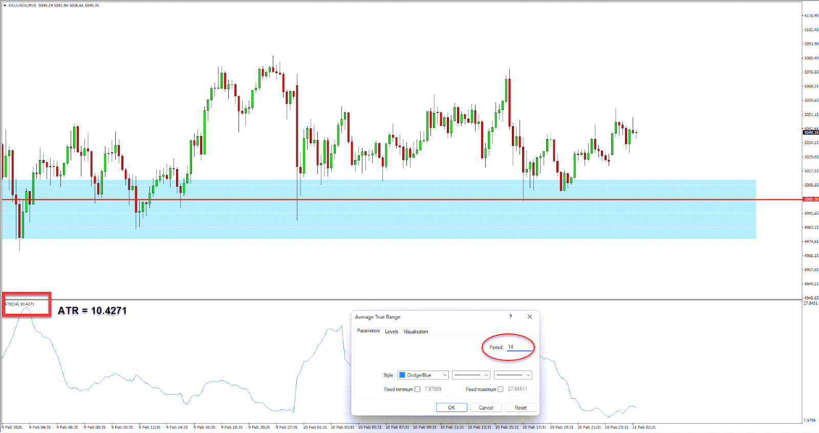 Sebagai contoh, kita set ATR dengan settingan default saja yaitu periode 14. Nanti ATR akan berada pada sub grafik yang tersedia di bawah chart utama. Tinggal lihat angkanya saja, misal di time frame M15 nilai ATR adalah 10 (dibulatkan). Maka di harga xauusd, dengan strategi apapun lebih mudah untuk menentukan jarak stop loss dan profitnya.