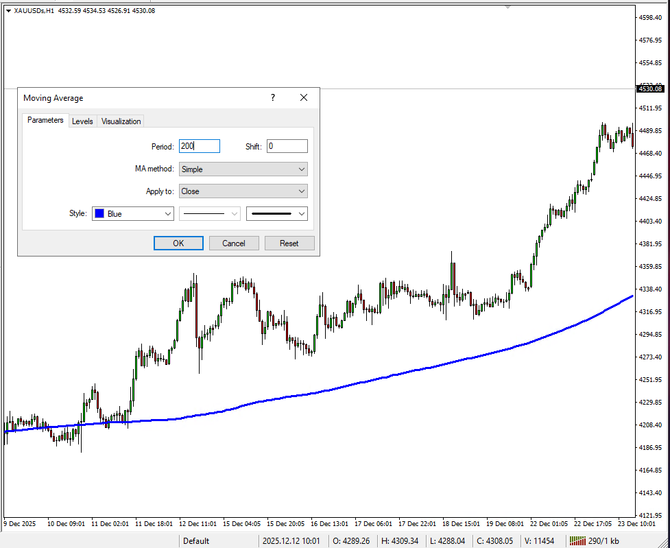 Back to basic, indikator sejuta umat ketika traders mulai trading itu adalah moving average. Simpelnya MA ini adalah harga rata-rata, jika harga suatu aset itu ada diatas harga rata-rata maka tren naik, jika di bawah makan tren turun, sesimpel itu.