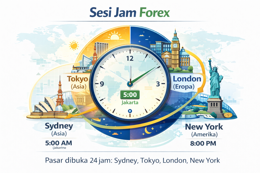 Untuk mengatur jadwal harian, kamu perlu memetakan empat sesi utama perdagangan dunia ke dalam waktu lokal di Indonesia. Hal ini sangat membantu agar kamu tahu kapan harus bersiap di depan layar dan kapan harus beristirahat.
