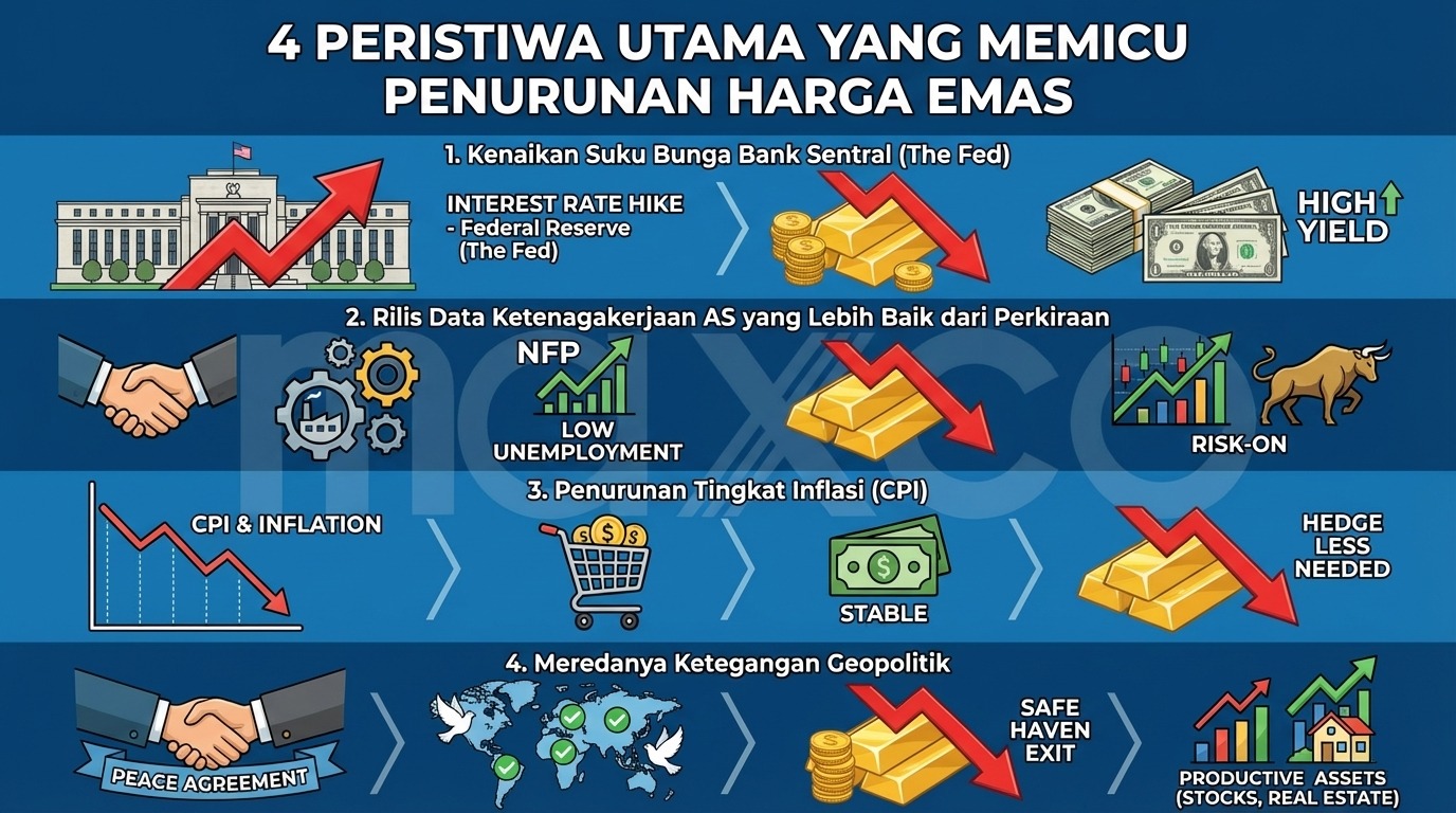 Dalam aktivitas trading emas, memahami penyebab pergerakan harga jauh lebih penting daripada sekadar menebak arah grafik. Berikut adalah peristiwa-peristiwa besar yang secara konsisten menyebabkan harga emas turun: