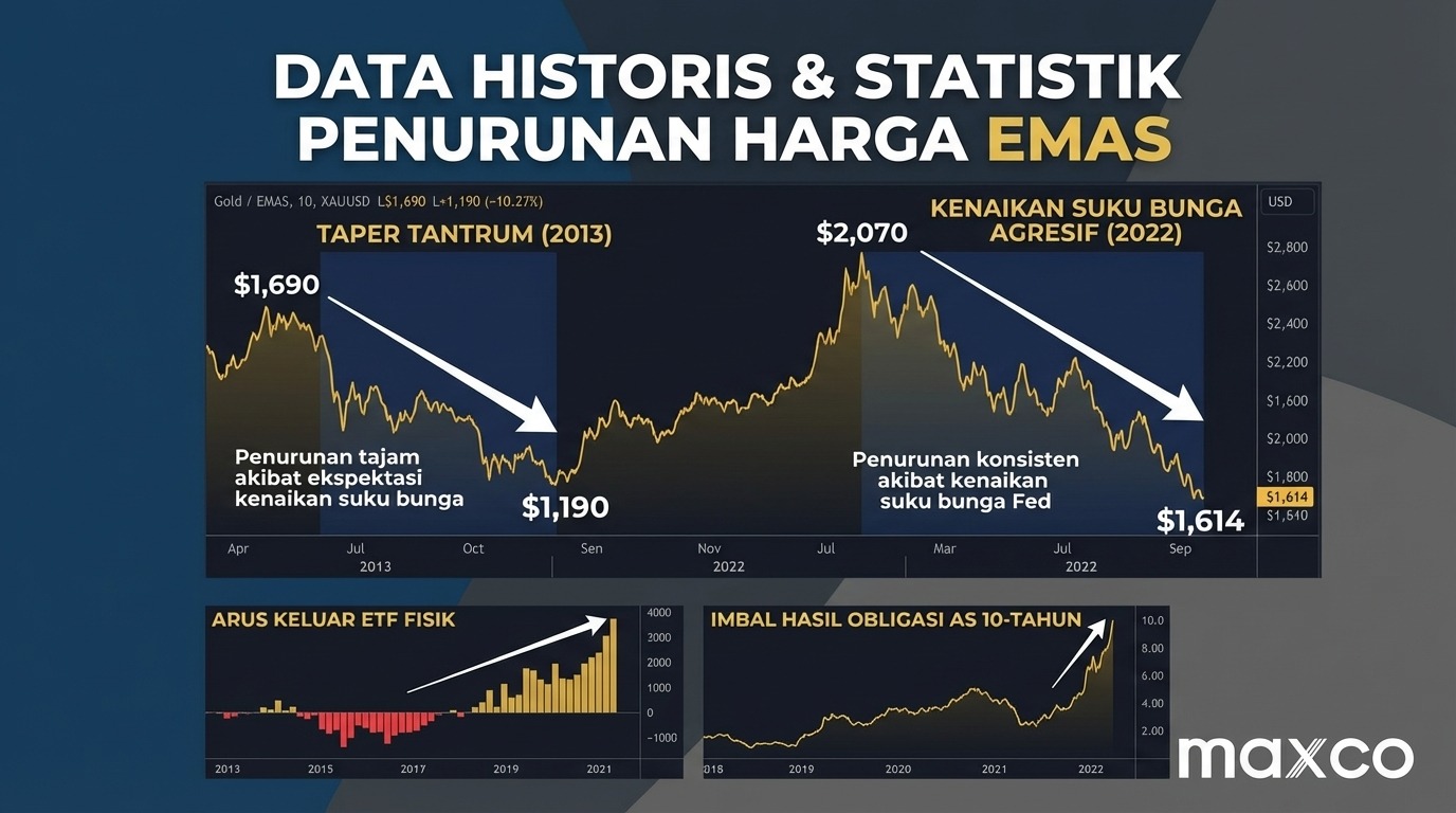 Artikel ini akan membahas secara mendalam mengenai mekanisme ekonomi yang memicu penurunan harga emas. Trader Maxco akan mempelajari peristiwa-peristiwa fundamental besar apa saja yang secara historis terbukti menekan harga emas, bagaimana cara membaca tanda-tandanya, serta solusi praktis untuk mengambil keuntungan dari situasi tersebut, khususnya ketika melakukan trading XAUUSD.