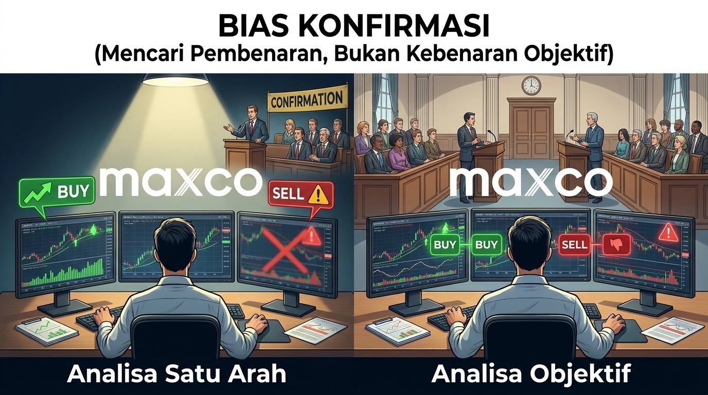 Kekeliruan psikologis yang sangat fatal adalah bias konfirmasi. Ini terjadi ketika Trader Maxco sudah memiliki keinginan atau prasangka untuk melakukan posisi beli (Buy) pada pasangan mata uang tertentu, lalu secara tidak sadar hanya mencari-cari sinyal atau alasan yang mendukung keinginan tersebut. Sementara itu, tanda-tanda jelas yang menunjukkan harga akan turun dengan sengaja diabaikan atau dianggap tidak penting.