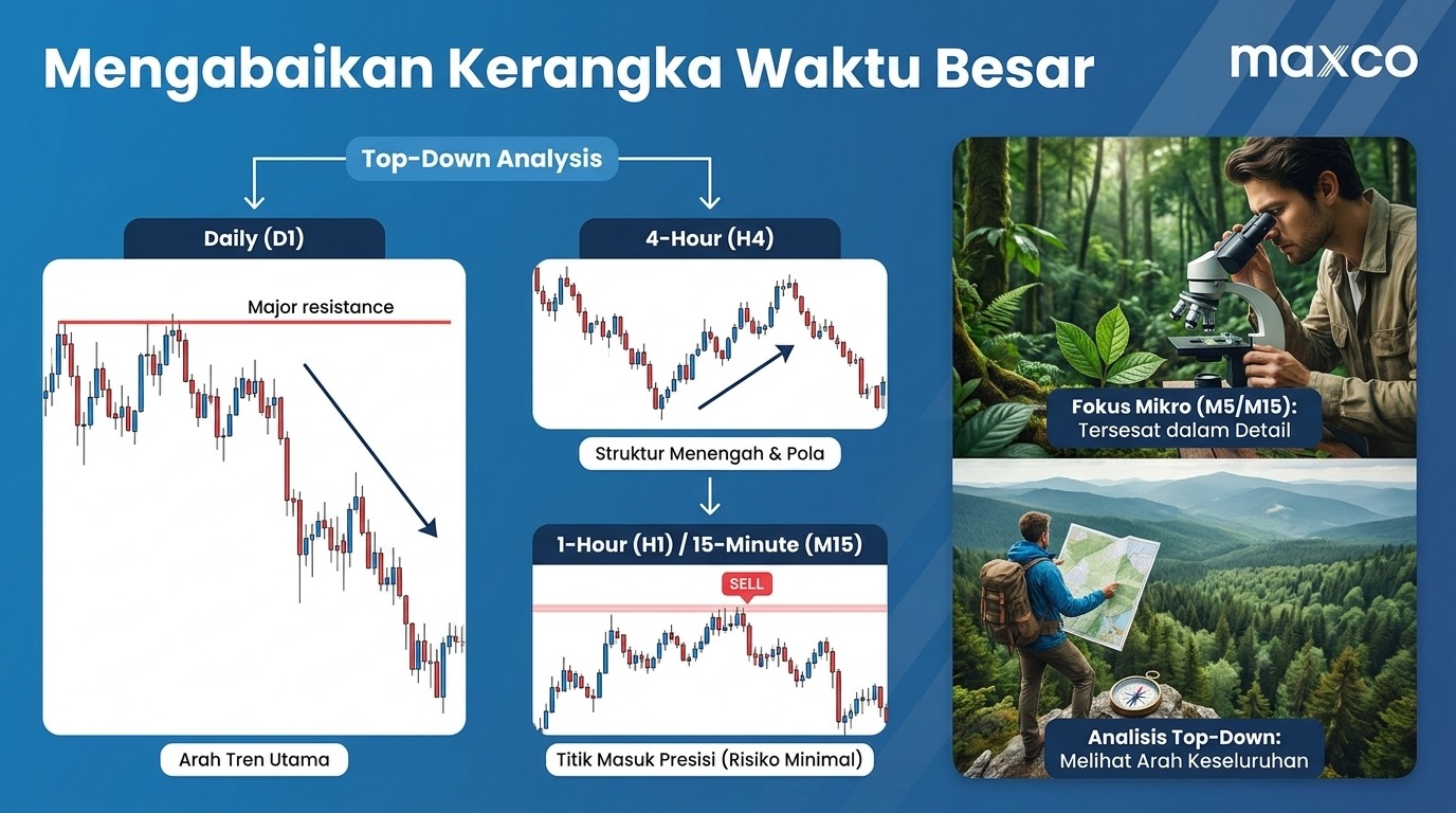 Menganalisis hanya dari grafik kecil membuat Trader Maxco kehilangan arah tren utama. Harga mungkin terlihat sedang naik tajam di grafik 15 menit, padahal pergerakan naik tersebut hanyalah koreksi kecil dari tren turun yang sangat kuat di grafik harian.