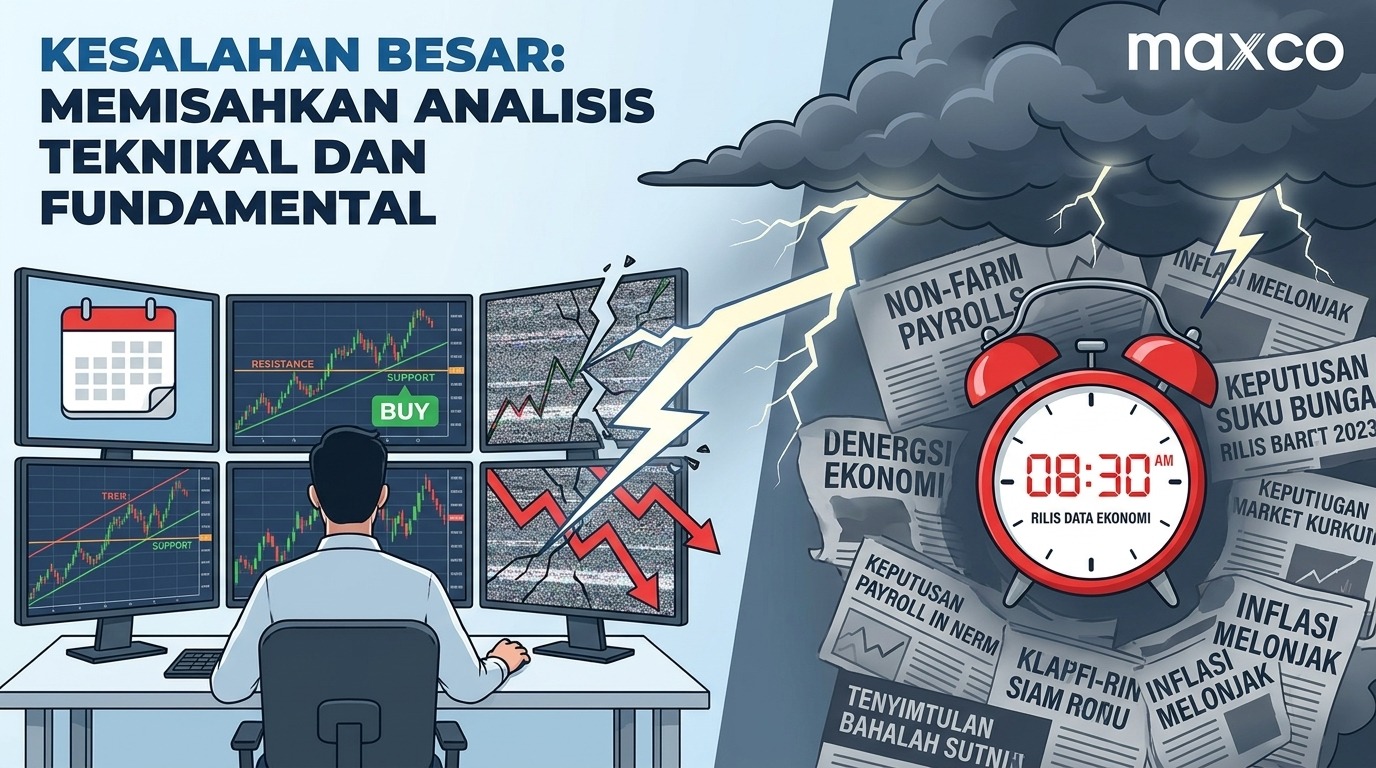 Trader pemula sering kali mengkategorikan diri secara eksklusif: hanya menjadi trader teknikal murni yang menolak melihat berita ekonomi, atau trader fundamental murni yang mengabaikan grafik. Kekeliruan besar terjadi saat Trader Maxco menganalisis pola grafik dengan sangat teliti, menempatkan posisi dengan rasio risiko yang bagus, namun mengabaikan fakta bahwa sepuluh menit lagi akan ada rilis data ekonomi krusial seperti data tenaga kerja (Non-Farm Payroll) atau keputusan suku bunga bank sentral.