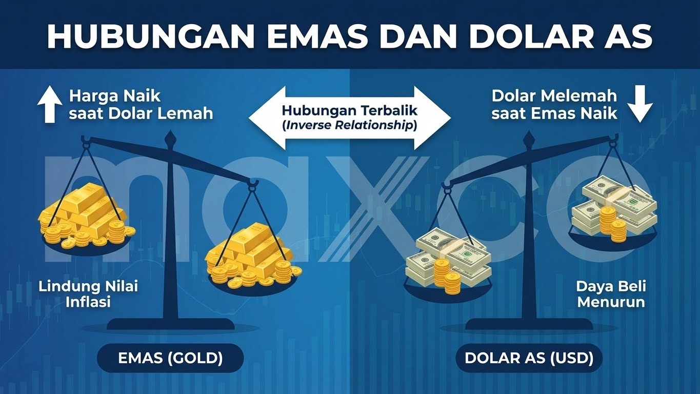 Trader Maxco harus memahami mekanisme harga. Emas dinilai dalam Dolar AS (XAU/USD). Secara matematis, jika Dollar menguat, harga emas cenderung turun, dan sebaliknya.