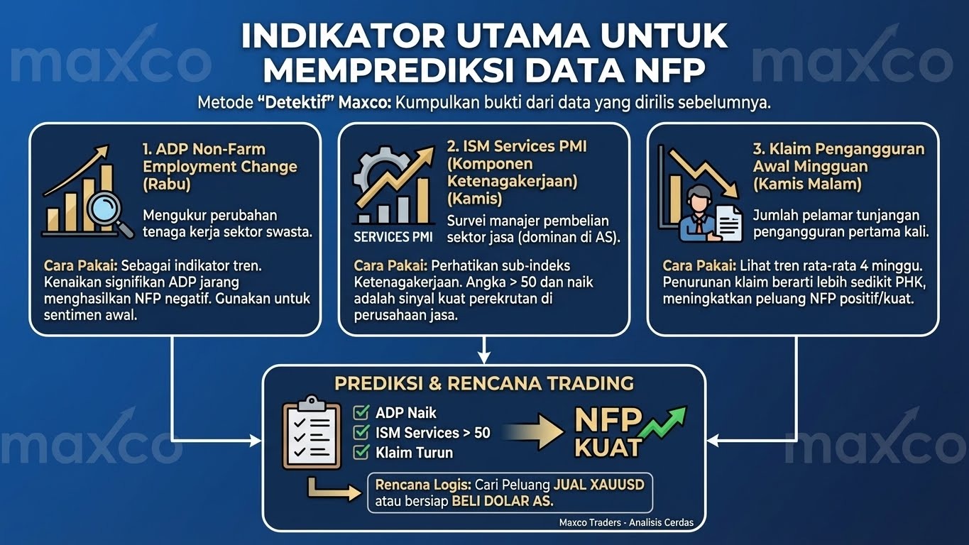 Bagaimana cara mendapatkan gambaran angka NFP sebelum hari Jumat? Trader Maxco dapat menggunakan metode “detektif” dengan mengumpulkan bukti dari data-data yang rilis lebih awal. Berikut adalah indikator pendahulu (Leading Indicators) yang paling akurat: