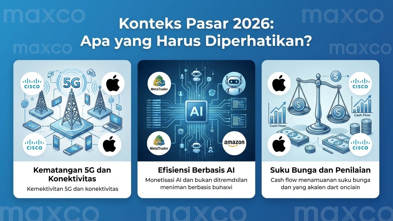 Tahun 2026 menawarkan peluang yang sangat menarik, namun membutuhkan ketelitian yang lebih tinggi. Tidak cukup hanya “membeli saham teknologi”. Trader Maxco harus memilah: Apakah saya ingin berinvestasi pada pembuat infrastruktur (Cisco, Apple)? Apakah saya ingin masuk ke sektor periklanan digital (Meta)? Atau saya ingin menangkap pemulihan daya beli konsumen (Amazon, Alibaba, eBay)?