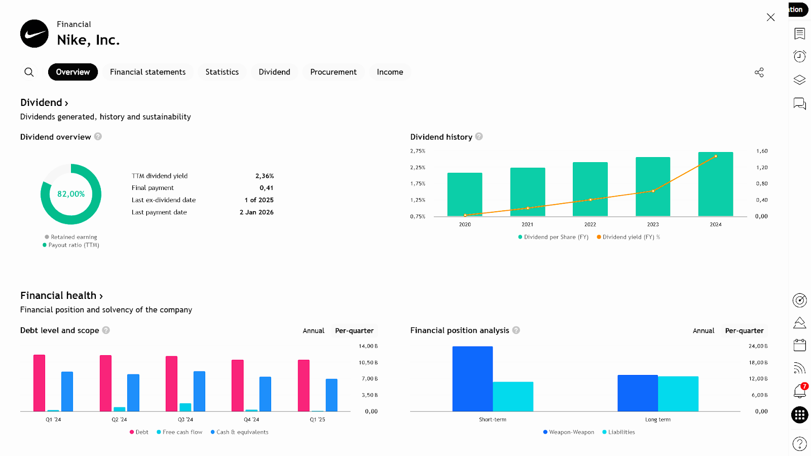 NIKE juga menaikkan dividen kuartalan menjadi US$0,41 per saham (sebelumnya US$0,40), setara US$1,64 per tahun dengan yield sekitar 2,5%. Langkah ini menunjukkan komitmen perusahaan terhadap pengembalian pemegang saham, meski rasio payout mencapai 84%, tergolong agresif.