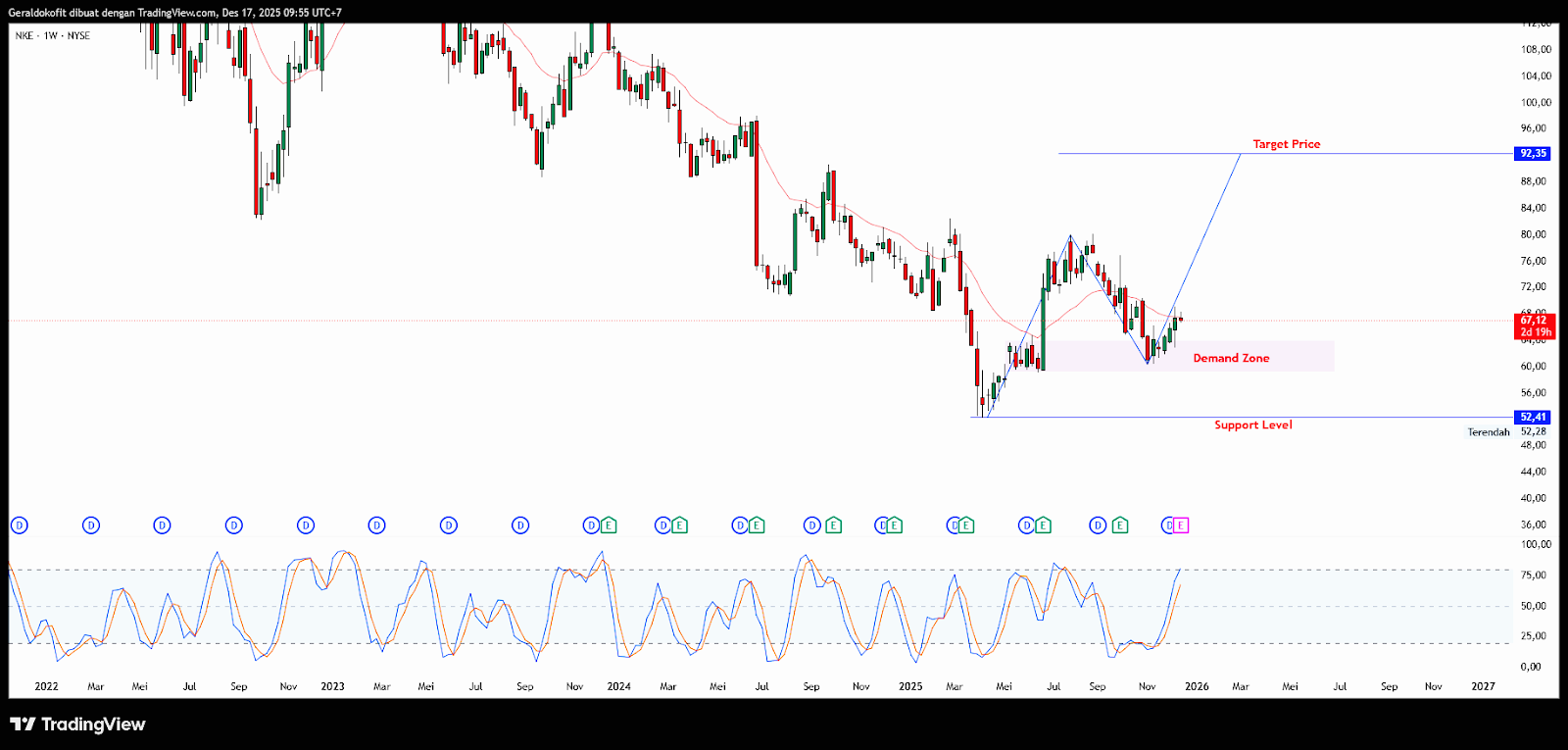 NIke saat ini mengalami area rejection (penolakan) pada Demand Zone sehingga ini membuat potensi penguatan harga kembali dan transisi menjadi Up trend kembali setelah mengalami penurunan tajam yang sangat signifikan. Kemudian daripada itu saham nike memasuki holiday season sehingga banyak orang yang melakukan spending cukup besar terhadap aktivitas Retails sales sehingga peluang ini dapat dimanfaatkan hingga Kuartal satu tahun 2026.