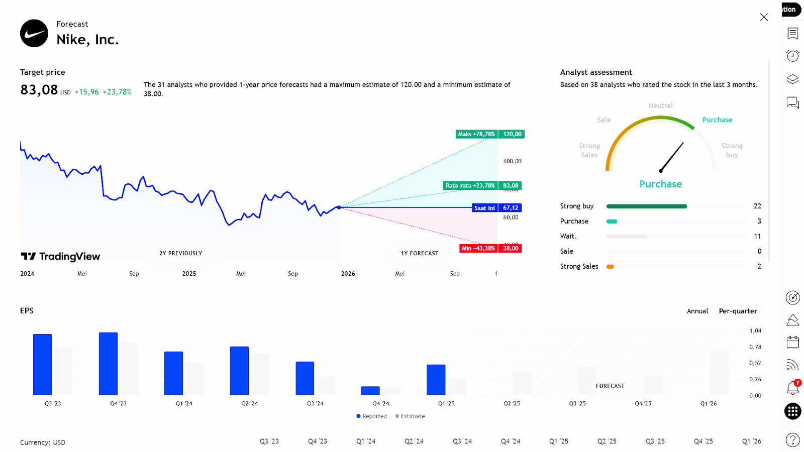 Pada kuartal sebelumnya, NIKE mencatat kinerja jauh di atas ekspektasi pasar, dengan EPS US$0,49 (vs estimasi US$0,27) dan pendapatan US$11,72 miliar (vs estimasi US$10,96 miliar). Pendapatan tumbuh 1% secara tahunan, dengan margin bersih 6,23% dan return on equity 21,16%. Untuk tahun fiskal berjalan dan tahun berikutnya, analis memperkirakan NIKE akan mencetak sekitar US$2 EPS per tahun.