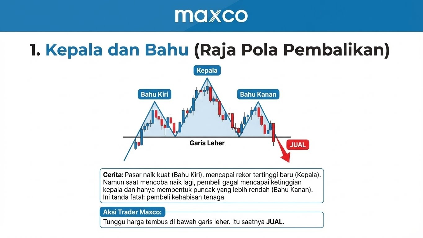 - Aksi Trader Maxco: Tunggu harga menembus garis leher (Neckline) ke bawah. Itu saatnya Jual (Sell).