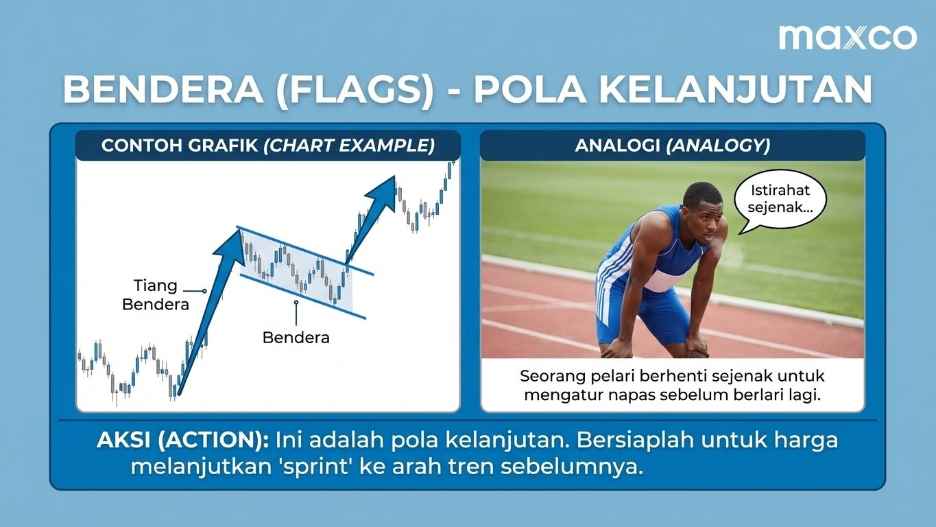 4. Flags (Bendera): Istirahat Sejenak Setelah harga bergerak tajam (tiang bendera), pasar istirahat sebentar membentuk pola bendera kecil.