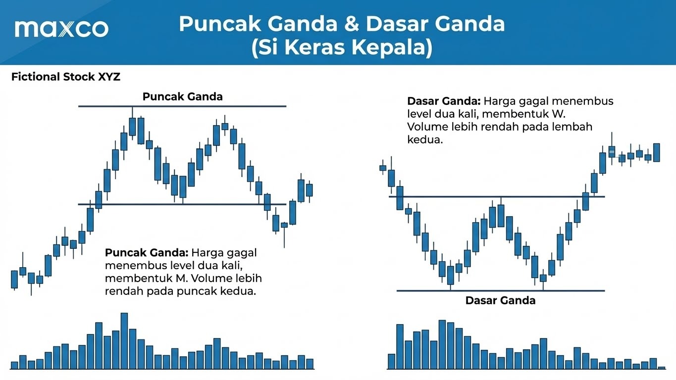 - Double Top/Bottom (Reversal): Filosofinya seperti mendobrak pintu terkunci dua kali namun gagal (membentuk huruf M atau W), sehingga harga menyerah dan berbalik arah.