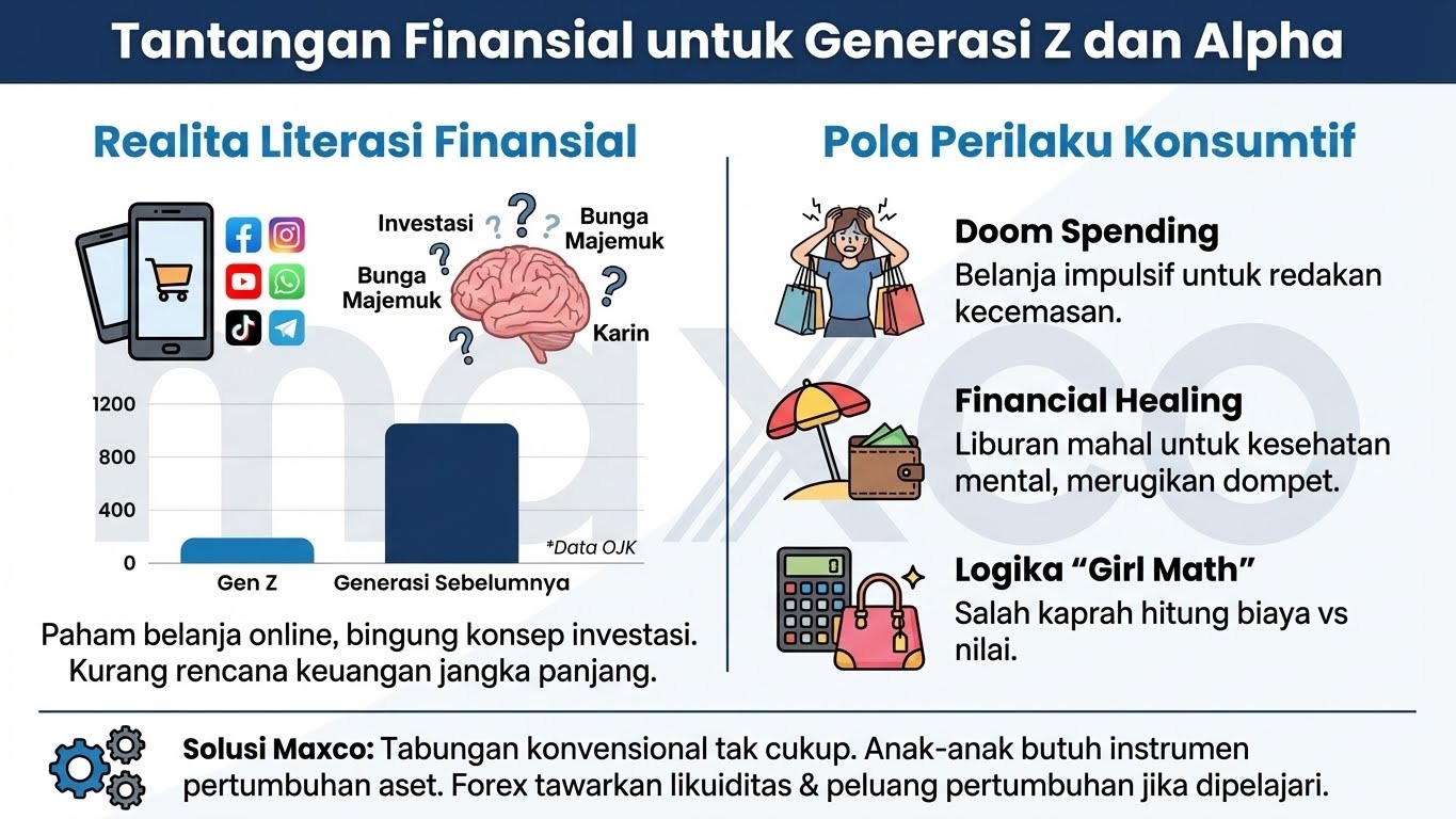 Anak-anak Generasi Z (lahir 1997-2012) dan Alpha tumbuh sebagai penduduk asli dunia digital. Mereka mahir menggunakan teknologi, namun seringkali kurang memiliki pemahaman mendalam tentang pengelolaan uang. Data Otoritas Jasa Keuangan (OJK) menunjukkan tingkat literasi keuangan Gen Z masih relatif rendah dibandingkan generasi sebelumnya. Banyak dari mereka paham cara belanja online, tetapi bingung tentang konsep investasi atau bunga majemuk.