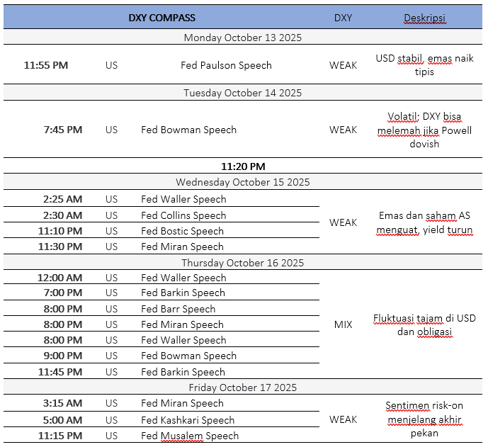 Pekan dimulai dengan pidato Fed Paulson, yang diperkirakan tidak membawa kejutan besar. Sebagai anggota yang lebih fokus pada stabilitas sistem keuangan, Paulson cenderung berhati-hati dalam memberi sinyal kebijakan. Bila ia menyoroti risiko perlambatan ekonomi dan tekanan di sektor kredit, pasar akan menangkap pesan dovish, memperkuat ekspektasi bahwa Fed siap menurunkan suku bunga lebih lanjut.