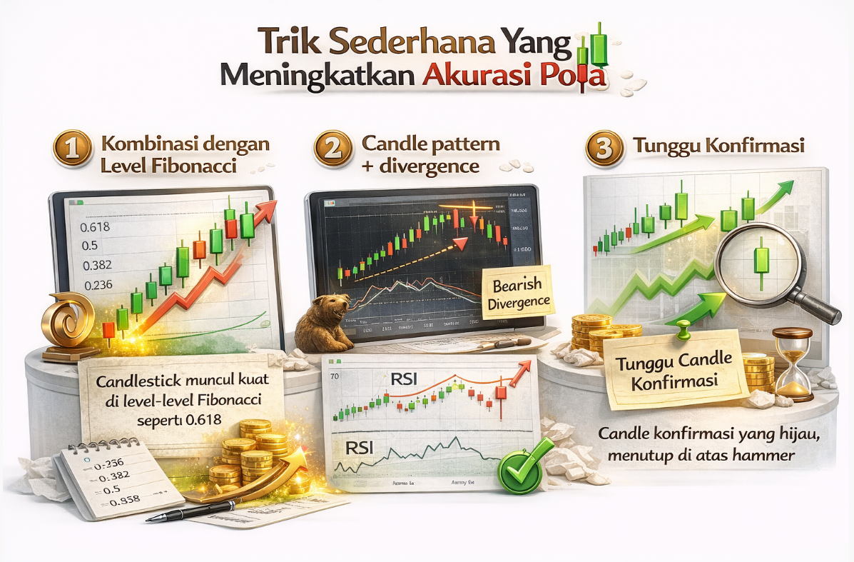 Ada beberapa trik sederhana yang ngebantu banget waktu pake pola candlestick: