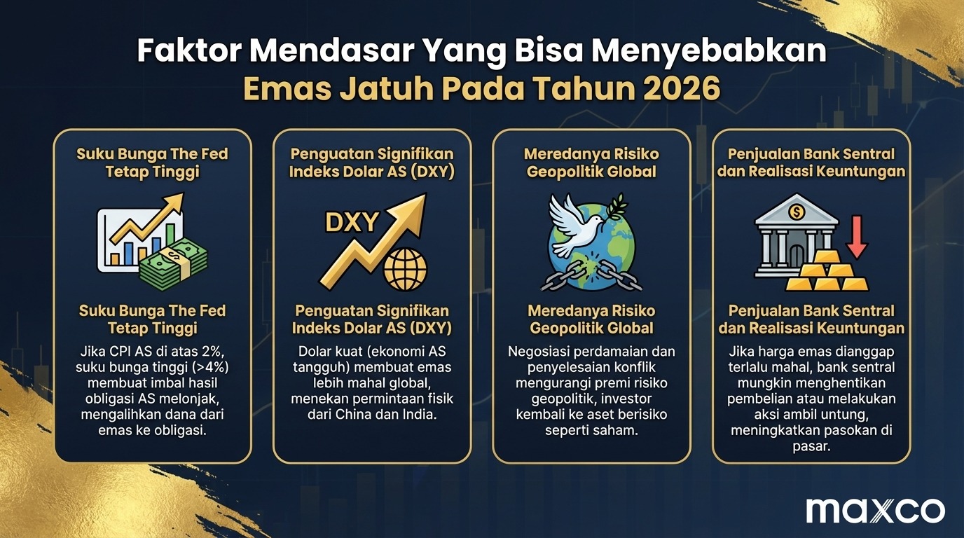 Menjalani tahun 2026, memproyeksikan pergerakan emas tidak boleh hanya dilihat dari kacamata satu arah. Menjadi seorang yang rasional berarti bersedia mengeksplorasi skenario terbalik. Meskipun proyeksi lembaga besar mematok angka fantastis untuk masa depan emas, Trader Maxco harus sangat waspada terhadap mesin ekonomi yang mulai mendingin akibat suku bunga tinggi, Dolar yang kembali perkasa, dan meredanya ketegangan di panggung politik dunia.