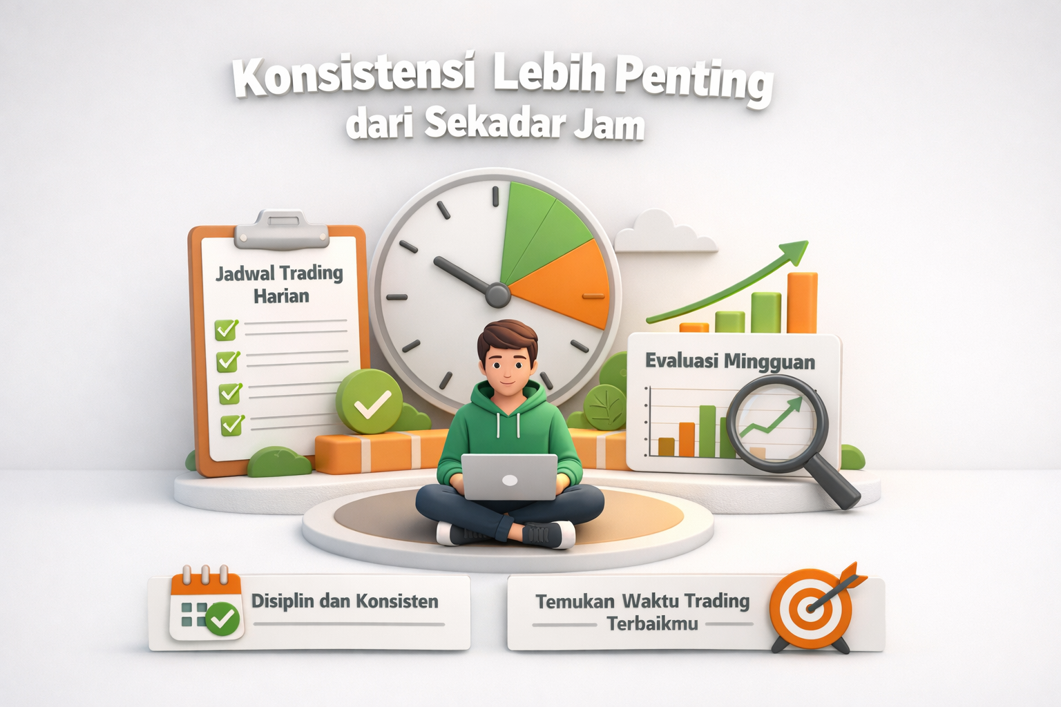 Jam trading yang bagus akan percuma kalau kamu nggak konsisten dengan rencana. Buat jadwal trading harian dan patuhi dengan disiplin.