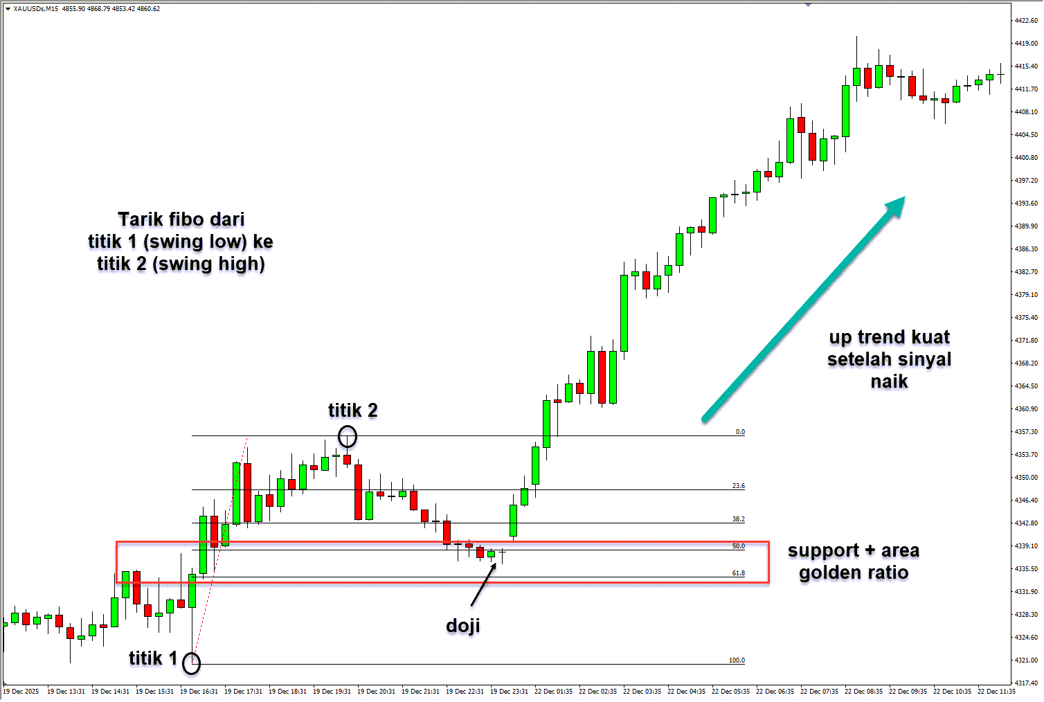 Kita kombinasikan semuanya, traders hanya fokuskan menemukan candle doji atau hammer saat terjadinya koreksi di level golden ratio fibonacci. Agar lebih jelas, jika trennya lagi naik, berarti kita tunggu trend tersebut koreksi (dalam hal ini harga bergerak turun).