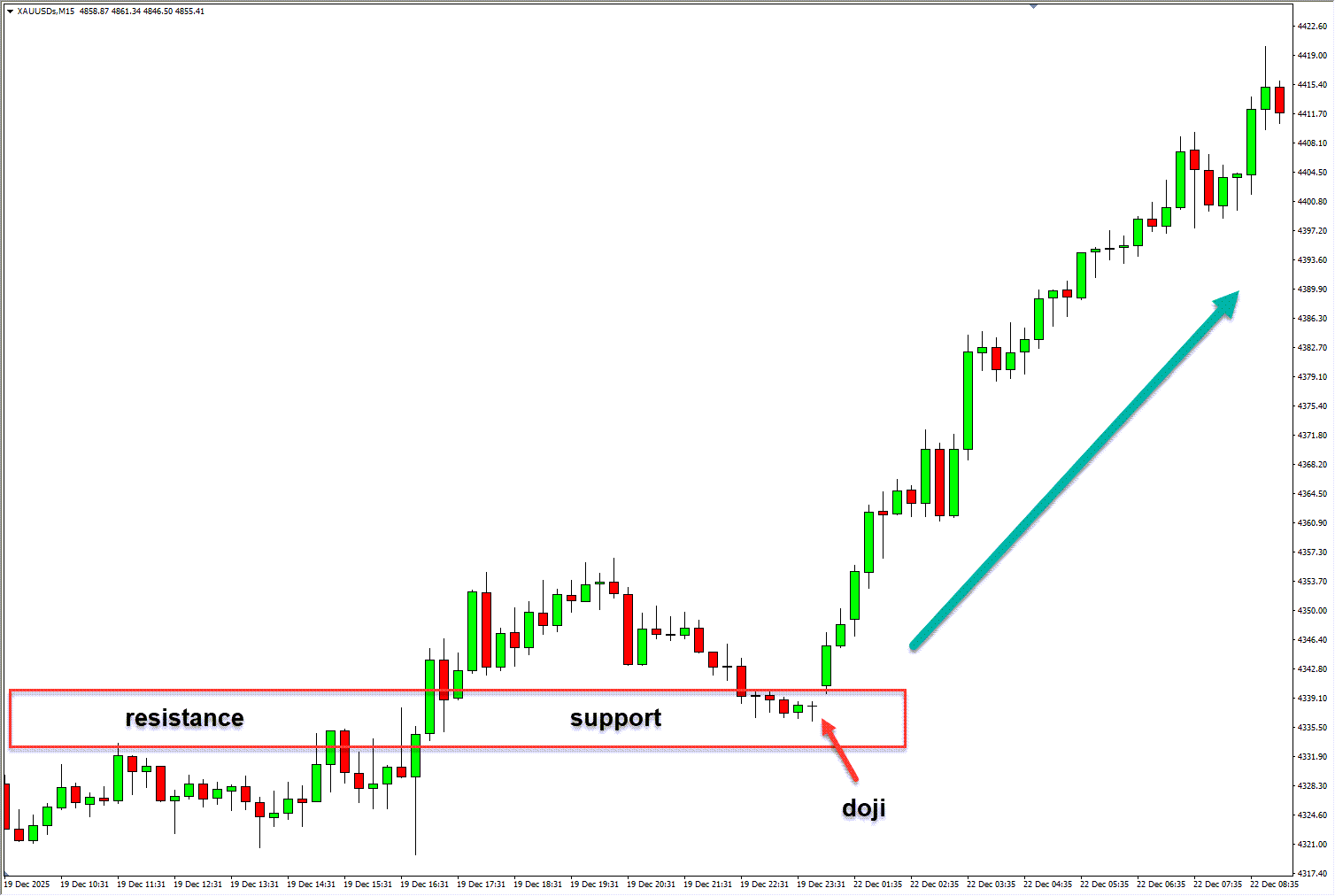 Misalnya xauusd akhir-akhir ini terus menembus rekor tertingginya, jadi kita lebih prefer ambil posisi buy di key level dalam hal ini supportnya. Setelah dikonfirmasi oleh candle bullish setelah doji terbentuk di area tersebut, maka bisa kita tarik kesimpulan bahwa tren akan kembali lanjut naik. Contoh seperti ini :